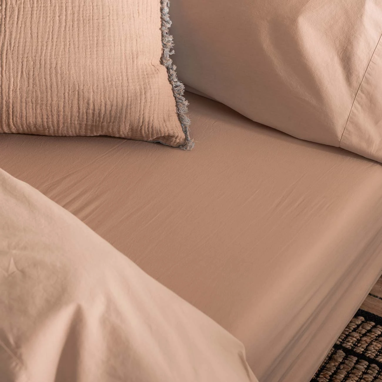 Washed for ultimate softness, our 100% cotton percale fitted sheets are perfect for lovers of no-fuss, high quality cotton bedding. The percale weave allows for a relaxed, matte finish while the loose nature of the weave makes the sheets highly breathable and airy. Our fitted sheets are elasticated all the way around, so that nothing comes untucked in the night and disturbs your sleep. Pictured here in the warming shade of Cafe au Lait, designed to complement the rest of our existing washed cotton bedding collection, or to simply look great on its own.
