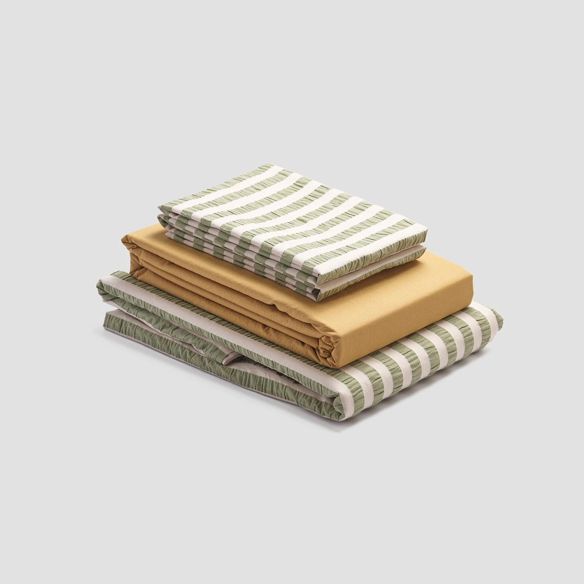 Inspired by the nostalgia of childhood holidays spent on the British coast, our Pear Seersucker Stripe Cotton Pillowcases feature an alternate stripe of Parchment and Pear: a verdant shade of green. Featuring our signature, loosely crinkled texture on one side and a smooth cotton percale underside, our seersucker stripe cotton bedding is made in Portugal from 100% sustainably-sourced cotton. If you are looking to mix and match our Pear Seersucker Stripe range, our plain washed cotton styles: Butterscotch, Cove Blue or Mulberry make for a charming bedding ensemble.