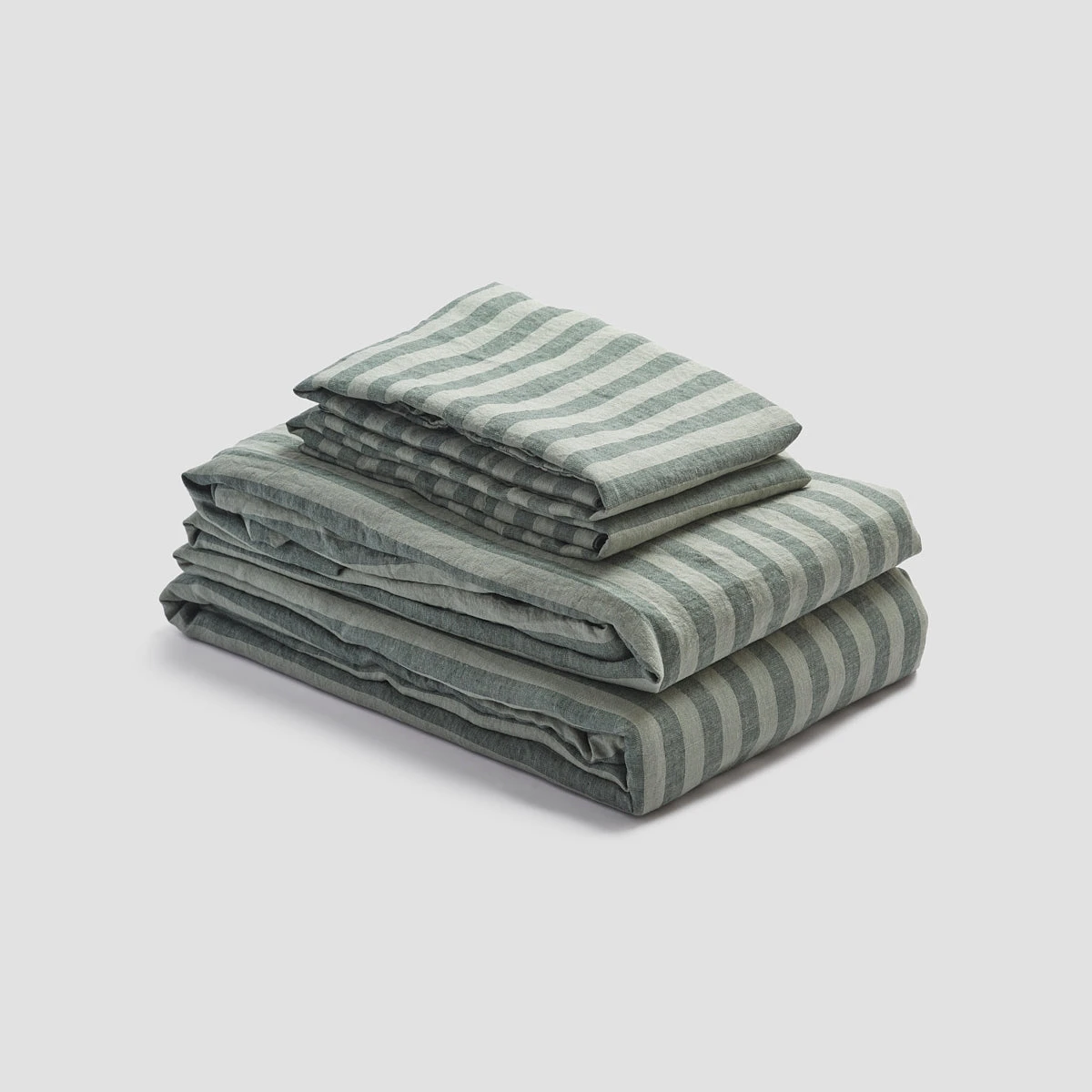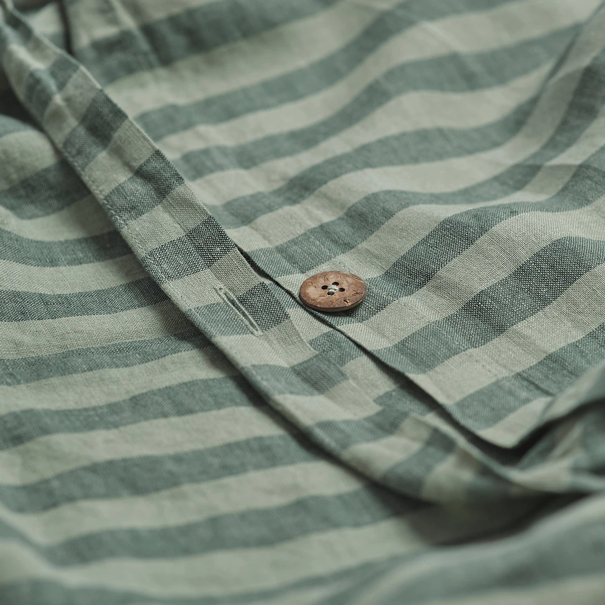 Get ready for some summer nostalgia with our British seaside-inspired Pine Green Pembroke Stripe linen bundle. Made in Portugal from 100% European flax, our linen bedding is brilliantly breathable to keep you cool when it’s hot and cosy when it’s cold. Best of all, the fabric gets softer with wear, so you’ll enjoy our linen bedding for years to come. Reminiscent of vintage deck chairs, this classic wide stripe brings a touch of the beach to the bedroom this season.